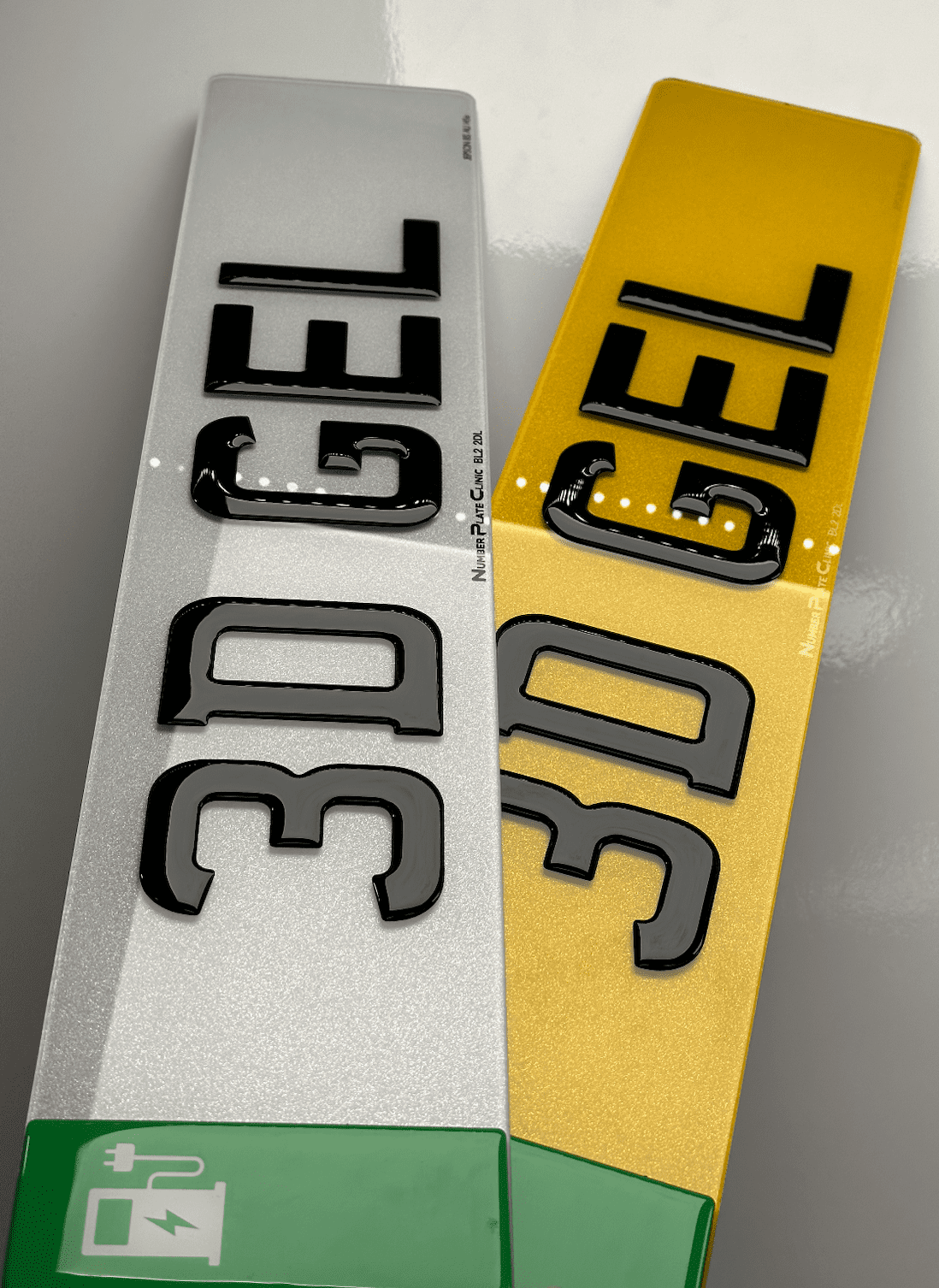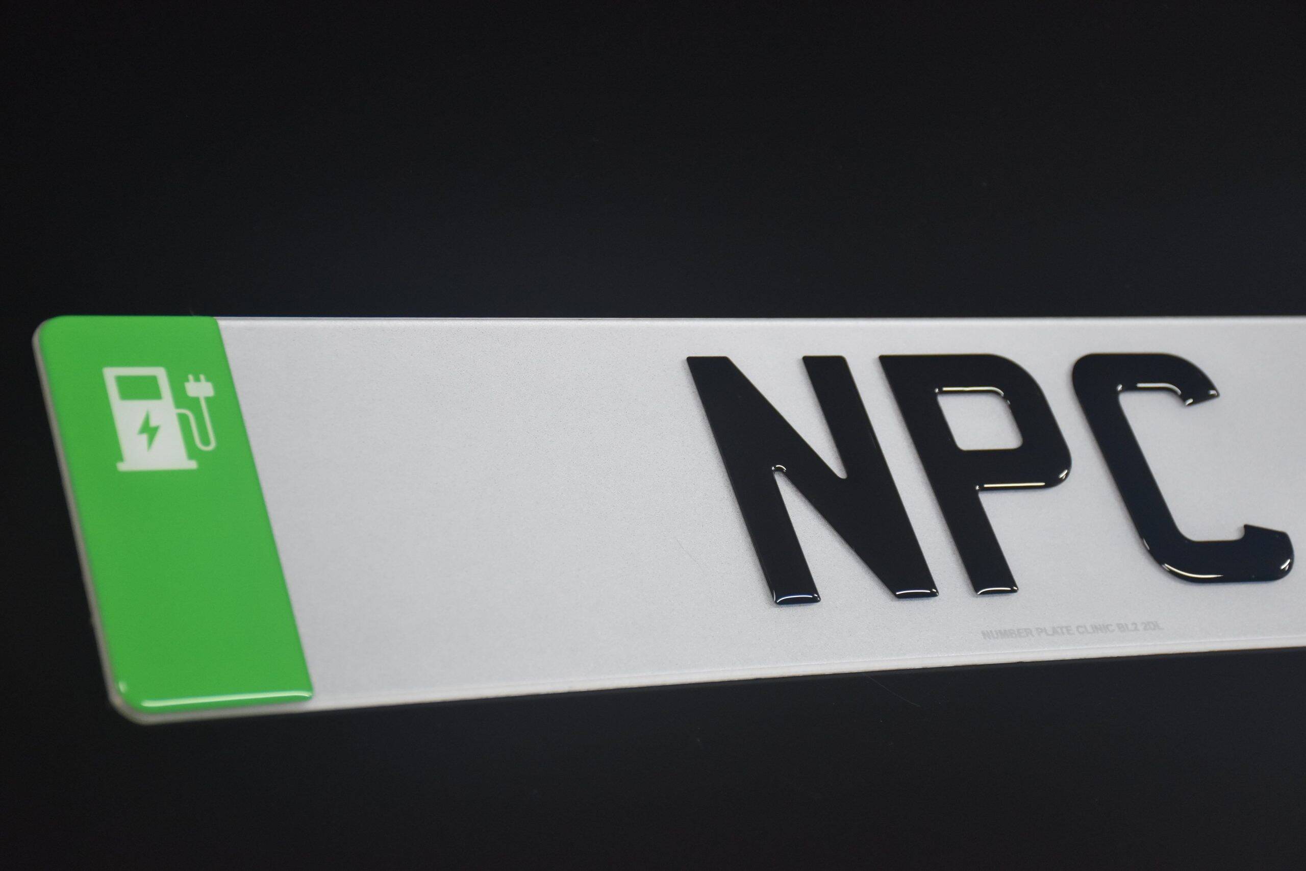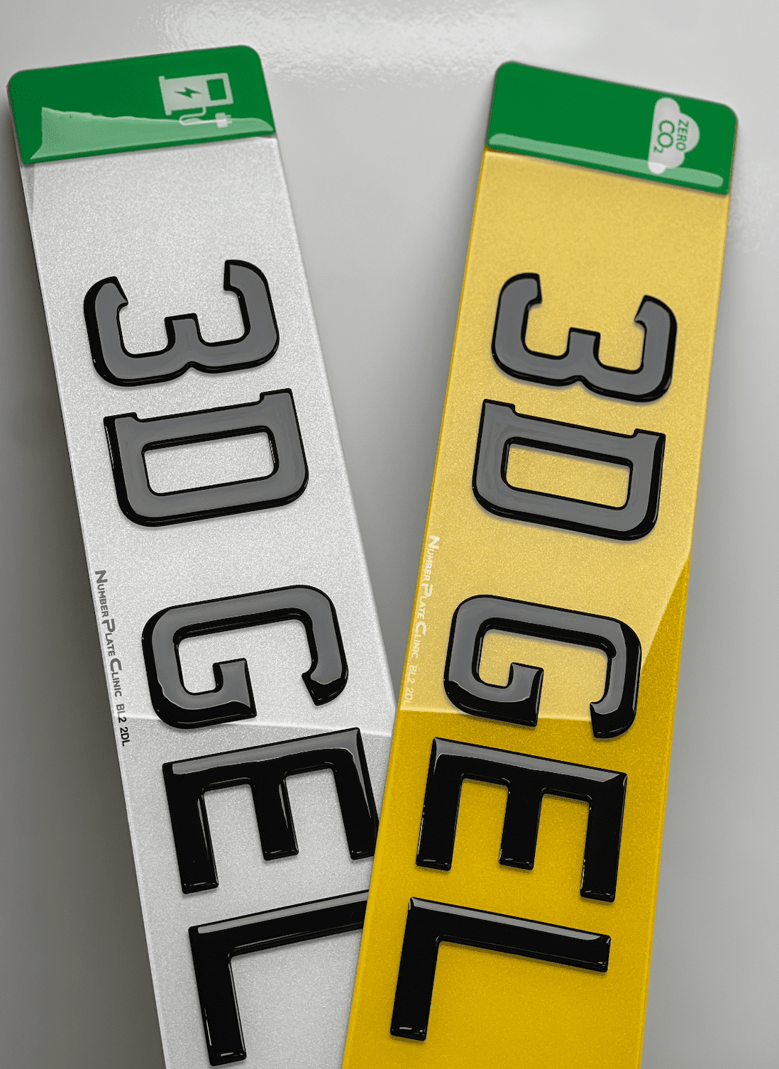 In summary, the 3D Black Gel EV Number Plate is created with a single layer of 1mm Black Gel, and it includes a green badge to designate the vehicle as an electric vehicle.