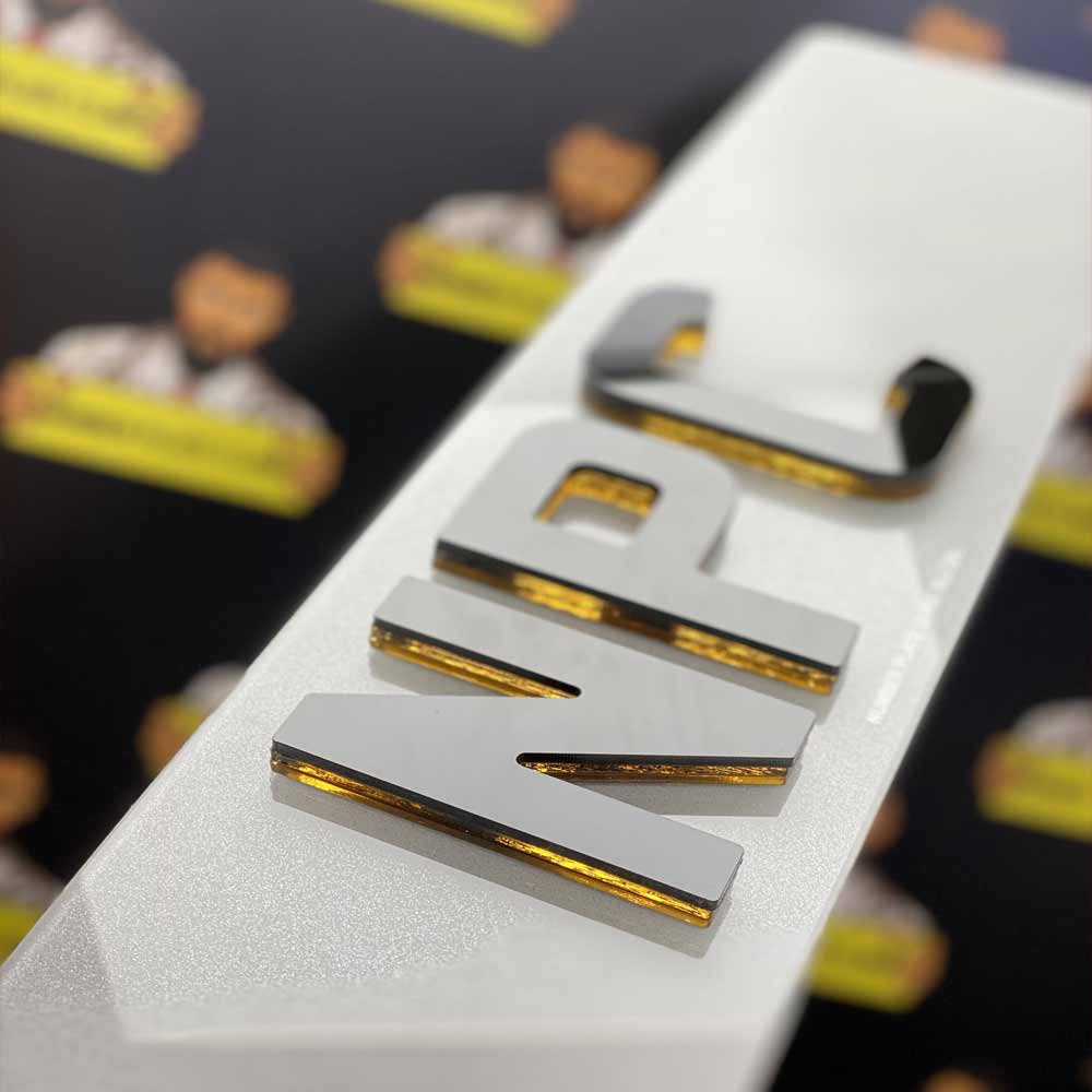 In summary, the Double Royal Gold x 4D Number Plate is created by combining three layers: two 3mm layers of Royal Gold acrylic at the bottom and a 3mm layer of 4D Laser cut acrylic on top. This combination results in a total thickness of 9mm for the product.