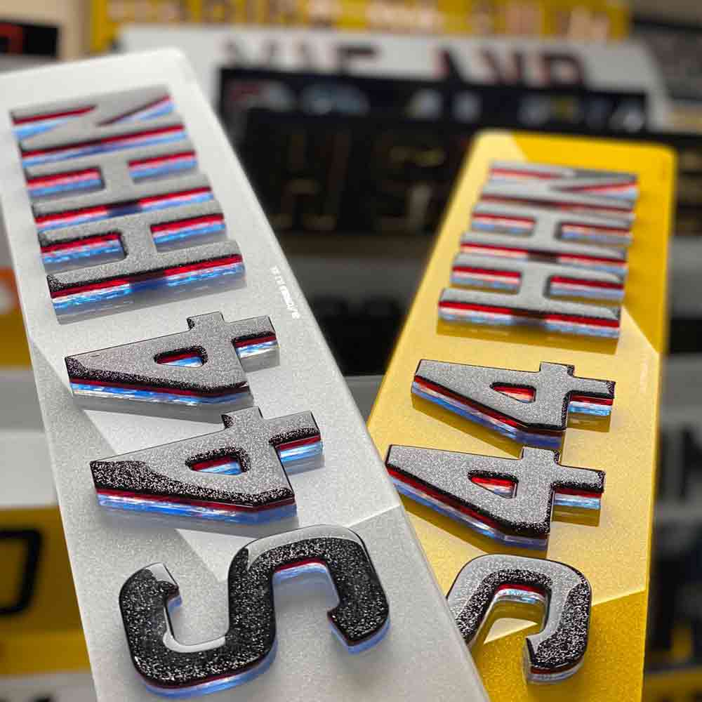 In summary, the M Sport x Hollow Number Plate is created by combining multiple layers: a 3mm Topaz layer at the bottom, a 3mm 4D Krystal acrylic layer in the middle, another 3mm Ruby layer on top, and finishing it off with a 1mm Starlight Gel layer. This combination results in a total thickness of 10mm for the product.